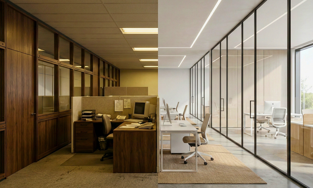 From brick walls to cubicles to open offices — and now to slim aluminium glass partitions — the journey reflects how