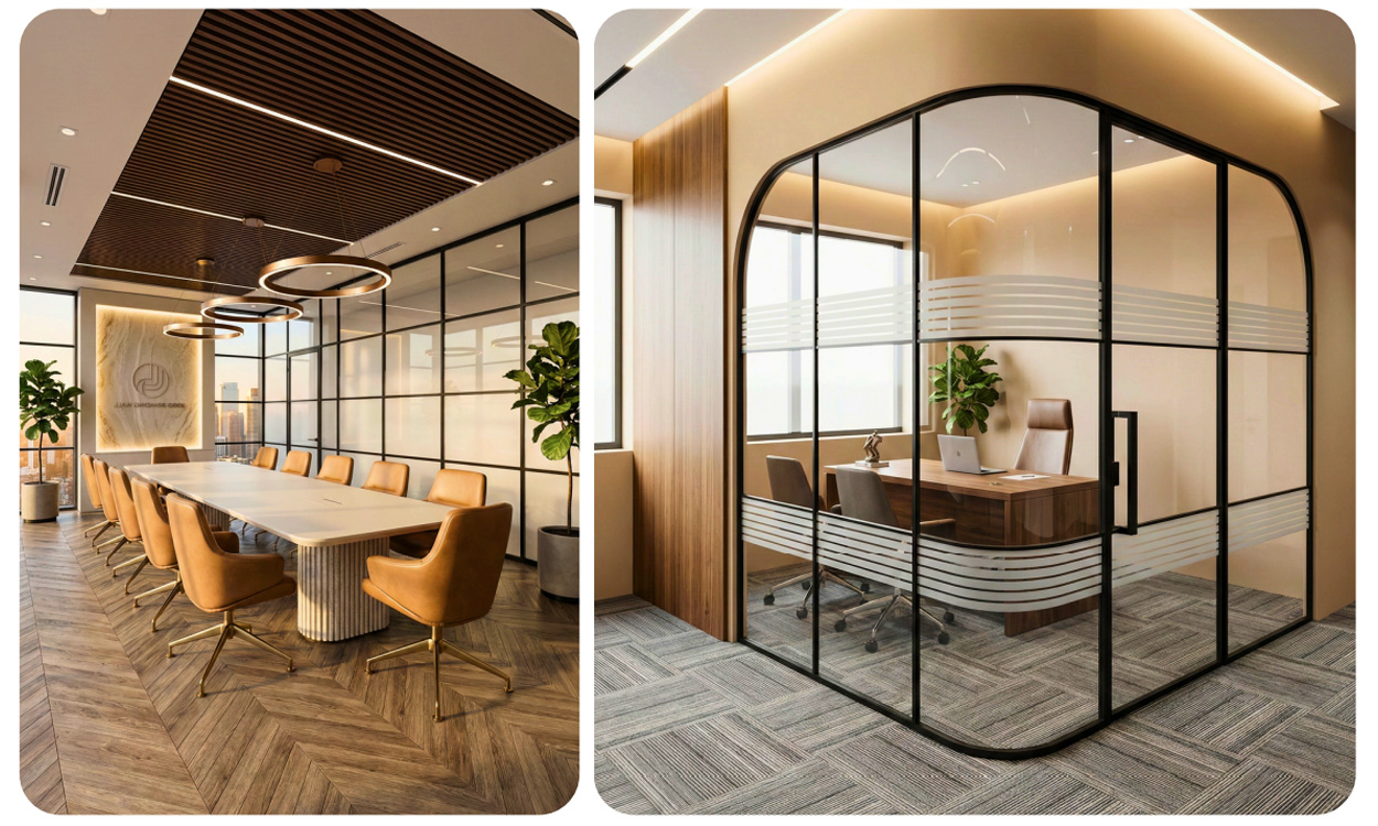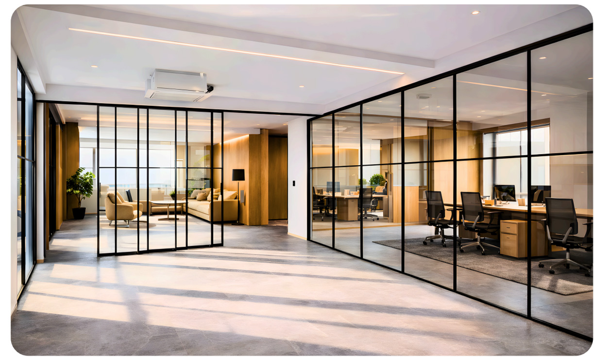 For premium modern offices, slim aluminium glass partitions offer the best balance between aesthetics, performance, and flexibility.