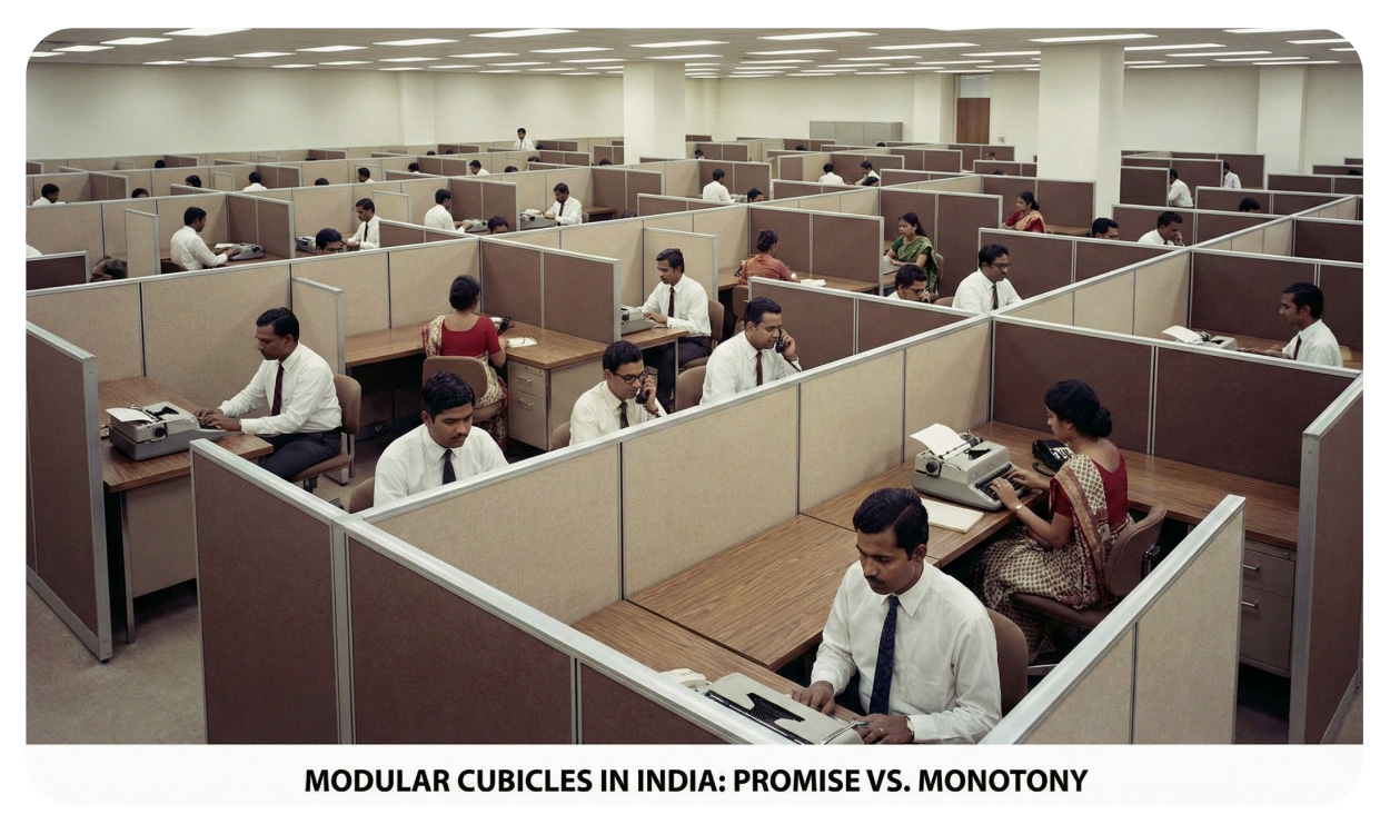 The 1960s introduced modular partition systems — most notably the cubicle concept popularized by companies like Herman